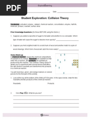 Student Exploration Collision Theory Worksheet Answers Promotiontablecovers from s3.studylib.net For gizmo, her smile epitomized who she was. Collision theory provides a qualitative explanation of chemical reactions and the rates at which they occur. Ninth grade lesson differentiated exploration of collision. One of these is the ekpyrotic model. Observe a chemical reaction with and without a catalyst. A basic principal of collision theory is that, in order to react, molecules must collide. The collision theory gizmo™allows you to experiment with several factors that affectthe rate at which reactants are transformed into productsin a chemical reaction.you will need blue, green, and orange markers or coloredpencils for the first part of this activity.1. Earth/space science, middle a good introduction to rates and collision theory.